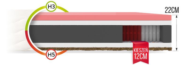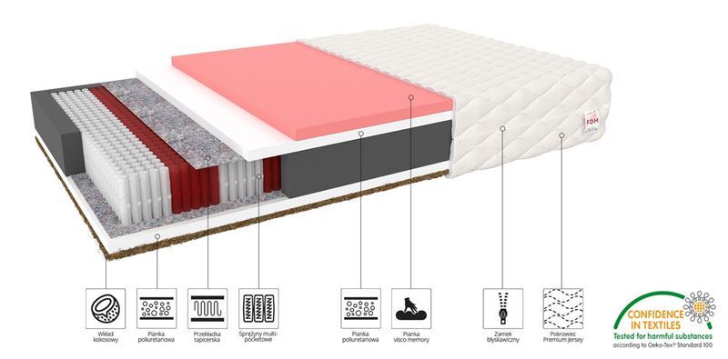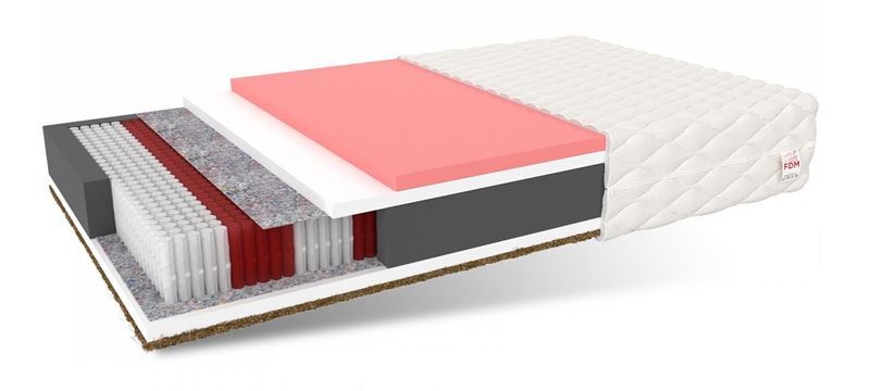 IVREA matracim ir daudzkabatu pamatne, kas to sadala 7 cietības zonās. Daudzkabeļu atsperu ir vairāk nekā standarta kabatas atsperēs. Viņi strādā neatkarīgi viens no otra, lai divi guļoši cilvēki nejustu diskomfortu savstarpēju kustību dēļ. Atsperes raksturo augsta izturība pret deformācijām un iespiedumiem. Tie ir izgatavoti NanoHARD tehnoloģijā, kas ievērojami palielina to kalpošanas laiku. Matracim ir 4 cm VISCO termoplastiska putuplasta ieliktnis ar ķermeņa atmiņas funkciju. Pateicoties tā īpašajai struktūrai, tas reaģē uz temperatūru un spiedienu un atjauno tā cilvēka formu, kurš uz tā guļ. No otras puses, izturīgam kokosriekstu ieliktnim piemīt pretsēnīšu īpašības.
