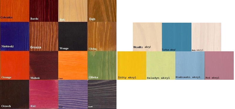 - Bordo, Buk, Dab, Calvados, Grusza, Wenge, Olcha, Niebieski, Mahon, Oliwka, Orange, Orzech, Roz, Fiolet, Grafit, Capri